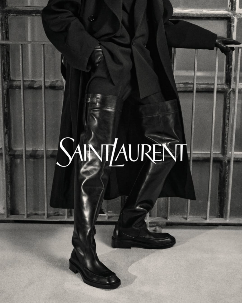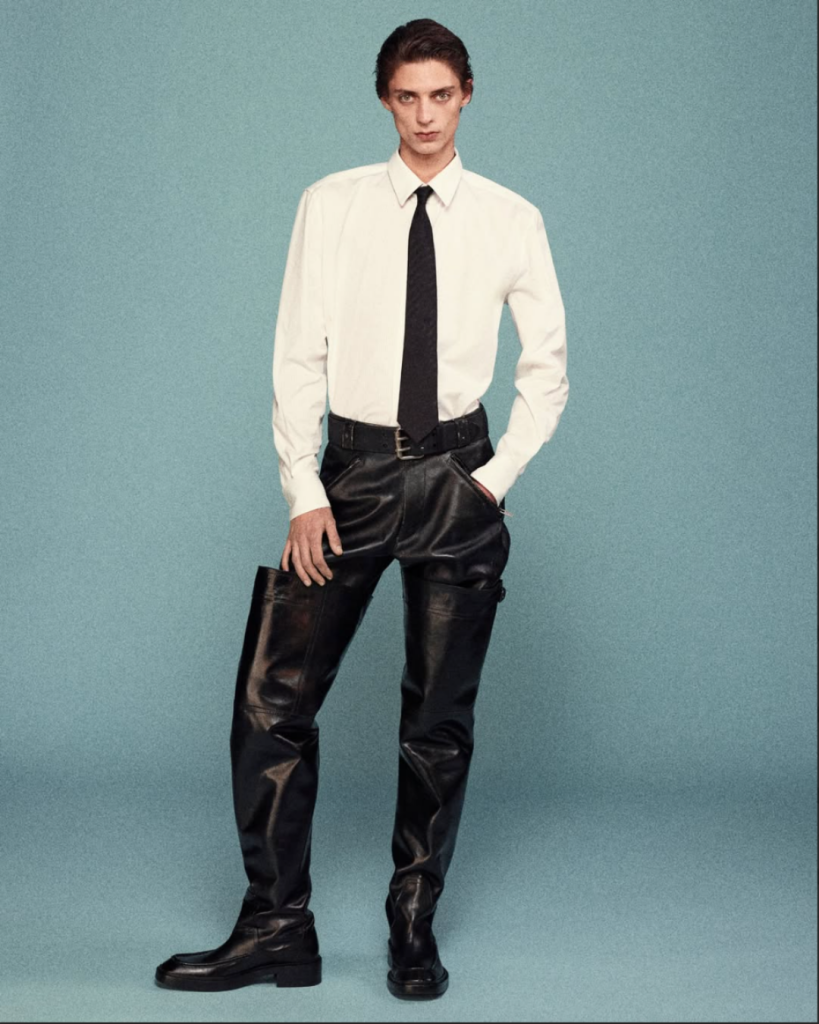 Una de las principales inspiraciones de Anthony Vaccarello esta temporada fue justamente esa estética mapplethorpiana. Las botas más allá del muslo —que remiten a la colección “Robin Hood” de 1963 de Yves Saint Laurent, originalmente pensada solo para mujeres— se reinventan como waders industriales. Hechas en ese cuero negro que Mapplethorpe convirtió en firma personal, funcionan como una especie de chaps fragmentadas que llevan el erotismo y la provocación al terreno de la sastrería. La pregunta aquí es: ¿quién se atreverá a llevarlas?