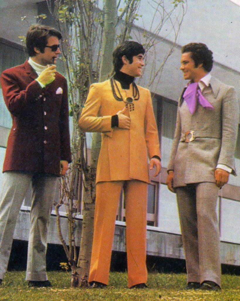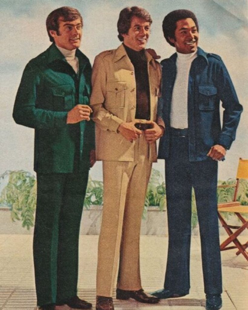 Los años 70 estuvieron marcados por la diversidad. El traje masculino comenzó a flexibilizarse: colores más vivos, camisas con cuellos amplios y un aire más relajado dominaban la escena. Para las mujeres, los 70 fueron la década en la que el traje de pantalón dejó de ser un tabú. La feminización del traje alcanzó nuevos niveles, convirtiéndose en un símbolo de igualdad en oficinas y en la vida pública.