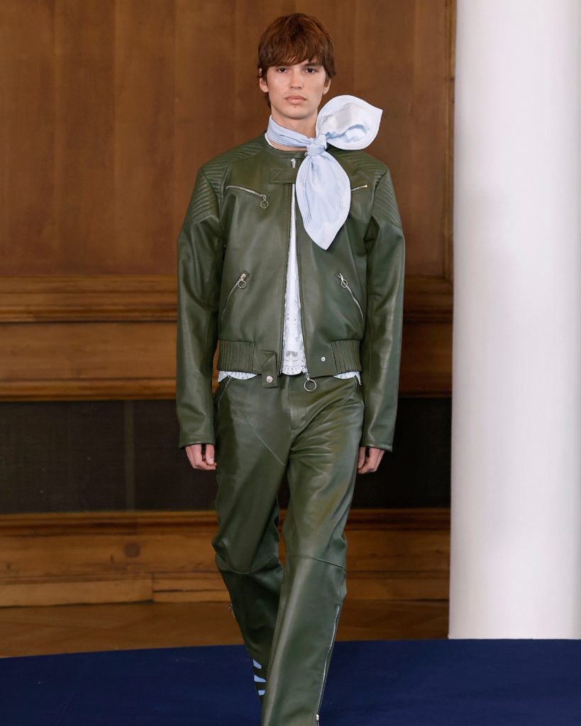La propuesta de “Eighteen” se construye sobre un lenguaje de contrastes que pone en diálogo la solidez de las estructuras con la delicadeza de los tejidos. Fue una colección amplia y coherente, donde convivieron siluetas con hombreras pronunciadas, cinturas marcadas y juegos de cortes que alternaban bloques de color y estampados. La presencia de vestidos en tafetán y de piezas en cuero, nylon o encajes reveló la destreza de la casa para desplazarse con naturalidad entre lo rígido y lo etéreo. Esa facilidad para trabajar materiales tan distintos demuestra no solo la técnica, sino también la claridad de una visión estética que entiende la moda como un terreno en el que la disciplina y la emoción se encuentran.