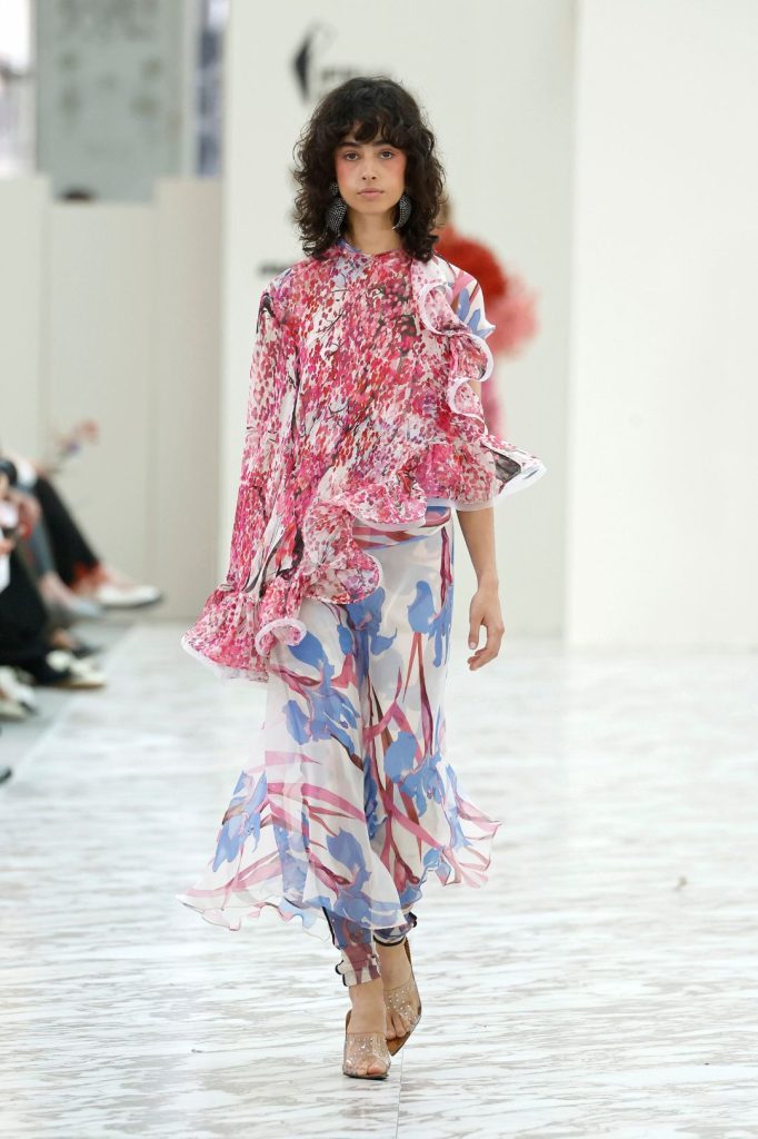 Su colección fue una mezcla de colores y personalidades, con salidas de vestidos negros en diferentes cortes, olanes y texturas que decoraban el cuerpo con elegancia. Después, hubo un cambio hacia flores azules y rosadas, una paleta de colores que anunciaba la primavera, donde la confección se enfocaba en el movimiento.