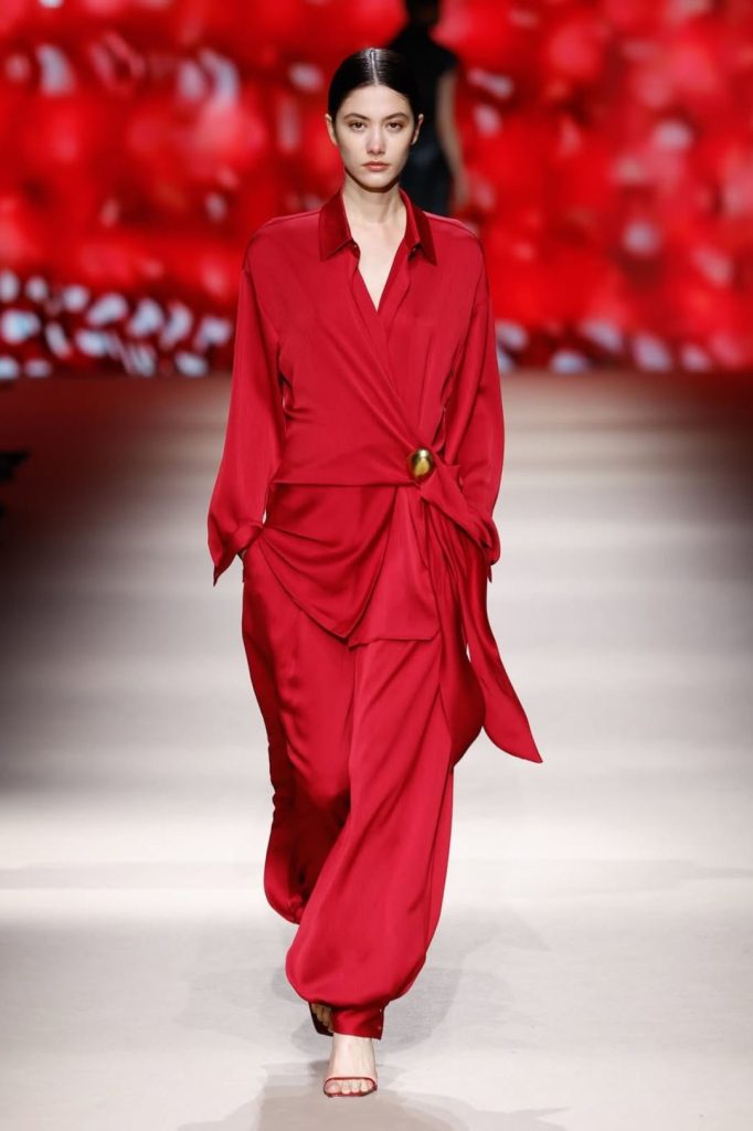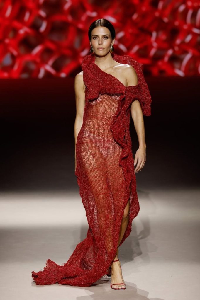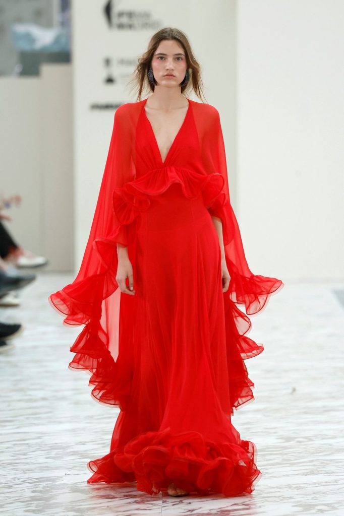 Para darle un toque más intenso, también vimos prendas rojas pasión con mangas largas y volantes. En general, Vidal logró crear piezas que entienden la belleza de la mujer, dejando ver siluetas sin exponerlas y dándoles fluidez en su andar.